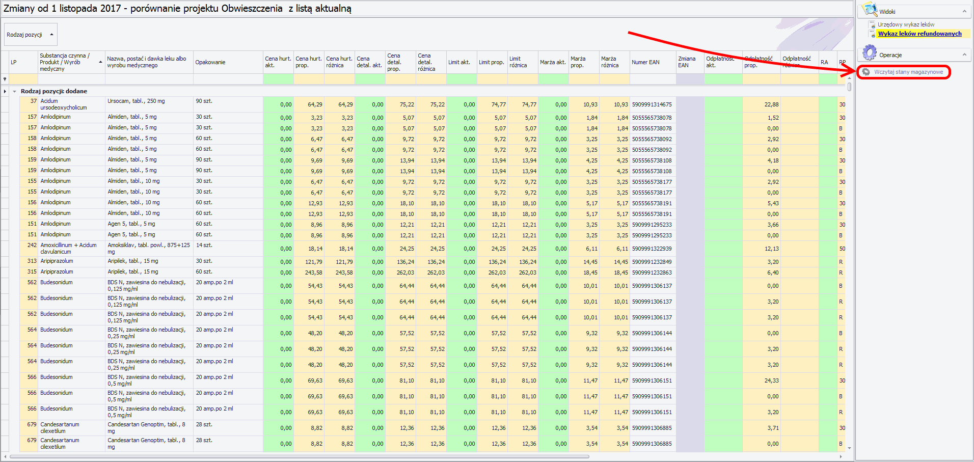 Operacja Wczytaj stany magazynowe pozwala na analizę zmian cen urzędowych na aktualne stany magazynowe Apteki.