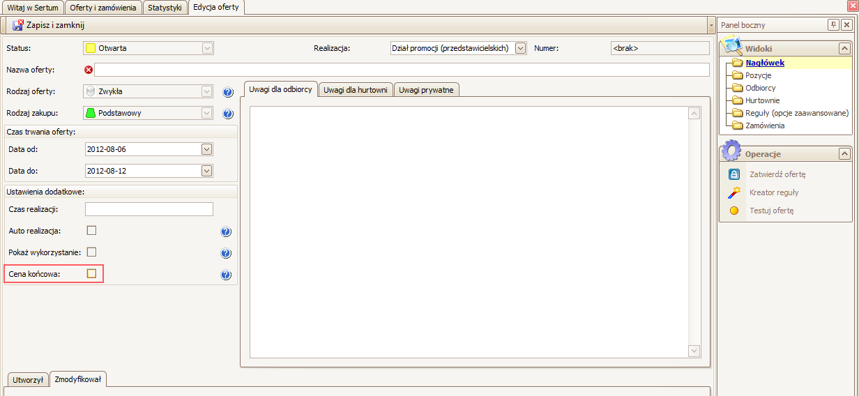 Pole Automatyczne zarządzanie aktywnością pozycji można zaznaczyć lub odznaczyć podczas tworzenia oferty, jak również po jej zatwierdzeniu. W tym celu należy w oknie Edycja promocji w widoku Nagłówek (moduł Promocje i zamówienia -> widok Moje promocje) zaznaczyć parametr „Auto zarz. akty. poz.”.
