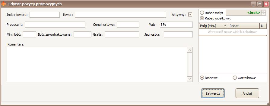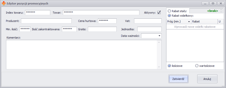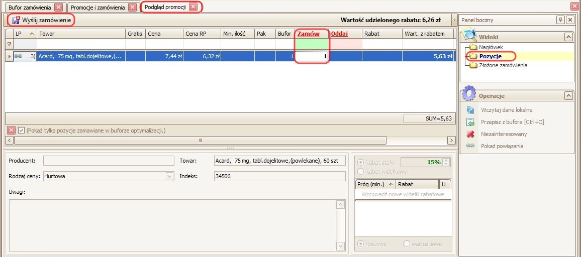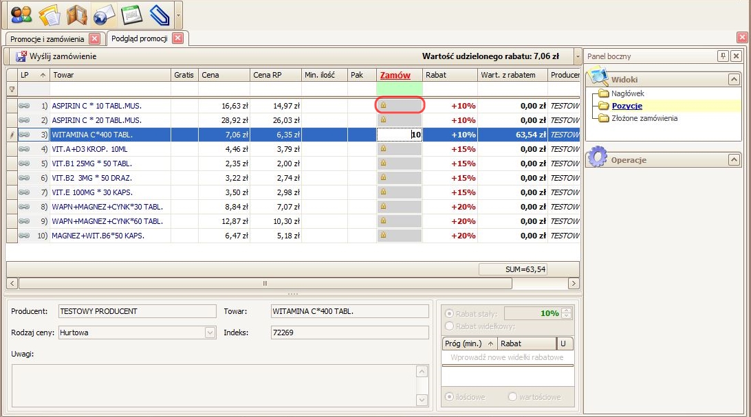 Dodatkowo w widoku Pozycje, przy każdej z pozycji oferty promocyjnej należy wpisać ilość zakontraktowaną towaru: