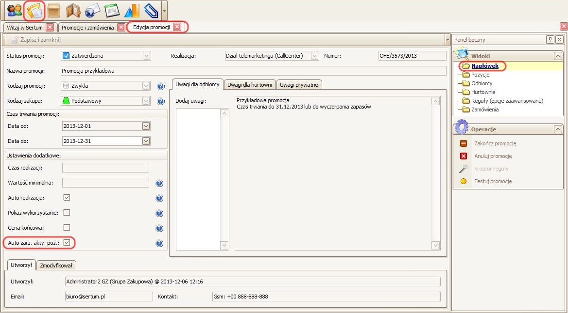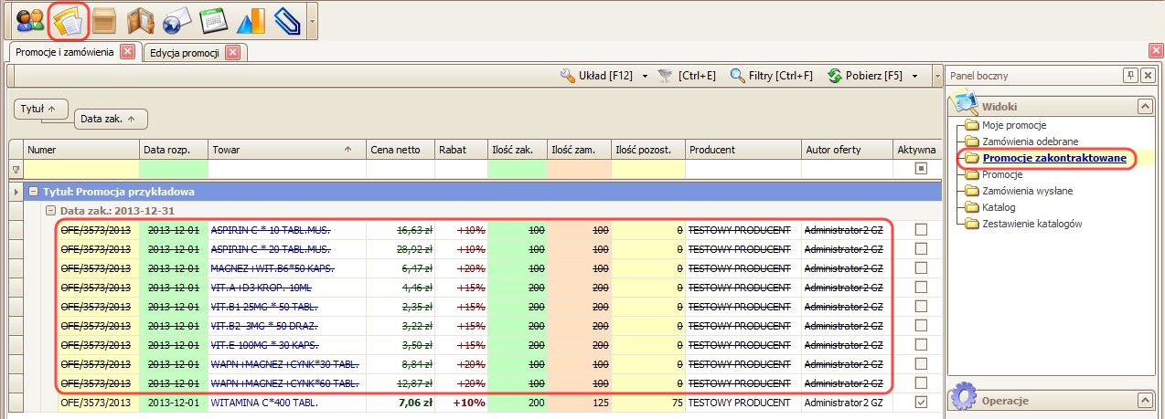 Wprowadzono funkcjonalność pozwalającą na automatyczne zarządzanie dostępnością pozycji w promocjach zakontraktowanych. Polegać będzie ono na automatycznej dezaktywacji pozycji promocji, w sytuacji przekroczenia ilości zakontraktowanej.