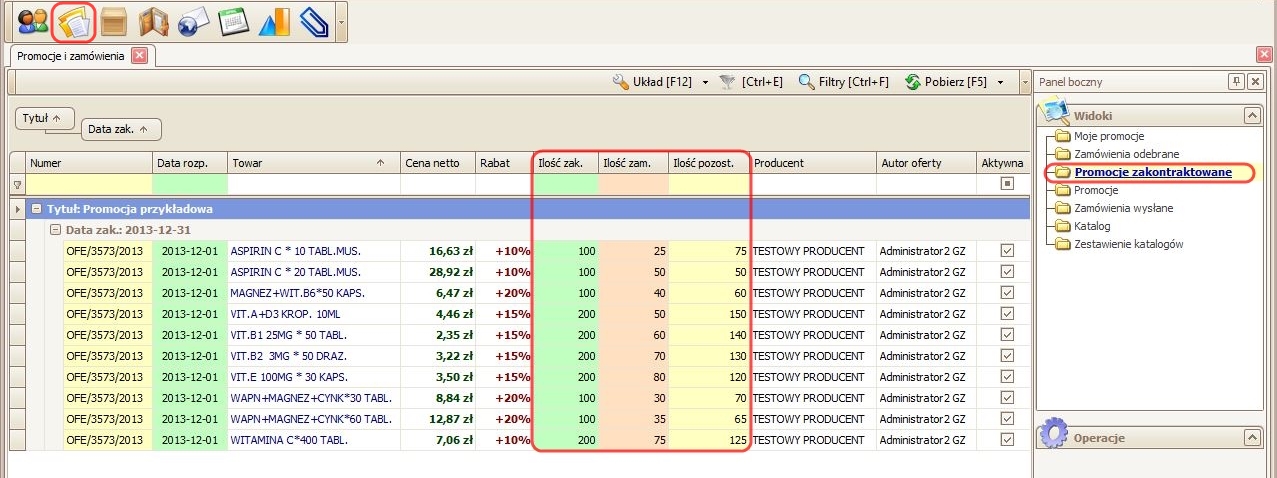 W widoku Promocje zakontraktowane (Moduł Promocje i zamówienia -> widok Promocje zakontraktowane), dla każdej pozycji promocyjnej, z określoną ilością zakontraktowaną, widoczne są następujące kolumny:
