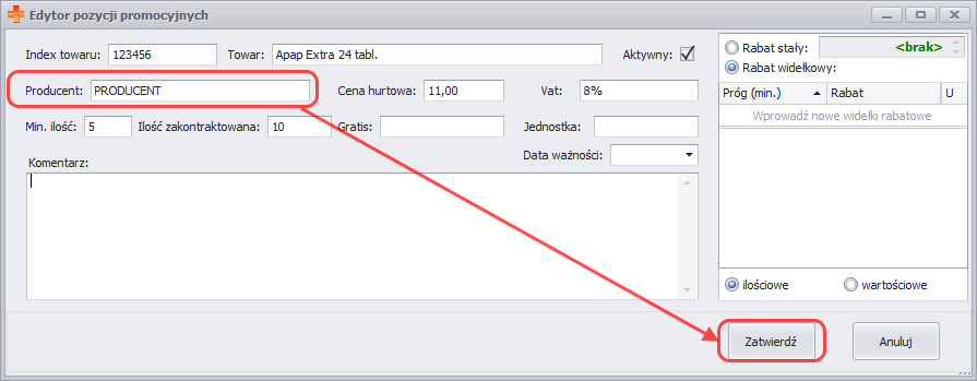 Ilość zakontraktowaną należy wpisać przed zatwierdzeniem promocji, jak również można ją edytować po zatwierdzeniu oferty.