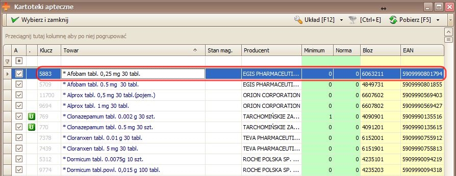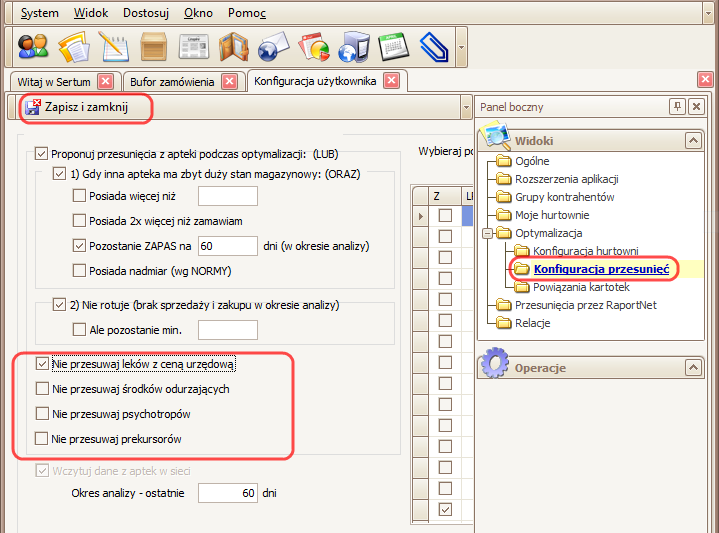 W Konfiguracji użytkownika zostały dodane parametry, które umożliwiają blokowanie proponowanie specjalnych typów leków do przesunięć międzymagazynowych (podczas optymalizacji zamówienia w Buforze zamówień). Blokować można leki urzędowe, środki odurzające, psychotropy i prekursory. Informacja o tym, czy dany lek należy do którejkolwiek z wymienionych grup, zaczytywana jest z karty leku w programie aptecznym.