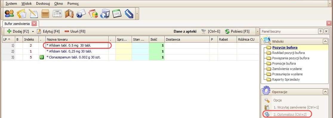 Po zapisaniu parametrów przesunięć należy dodać wybrany towar z magazynu aptecznego do bufora zamówień: