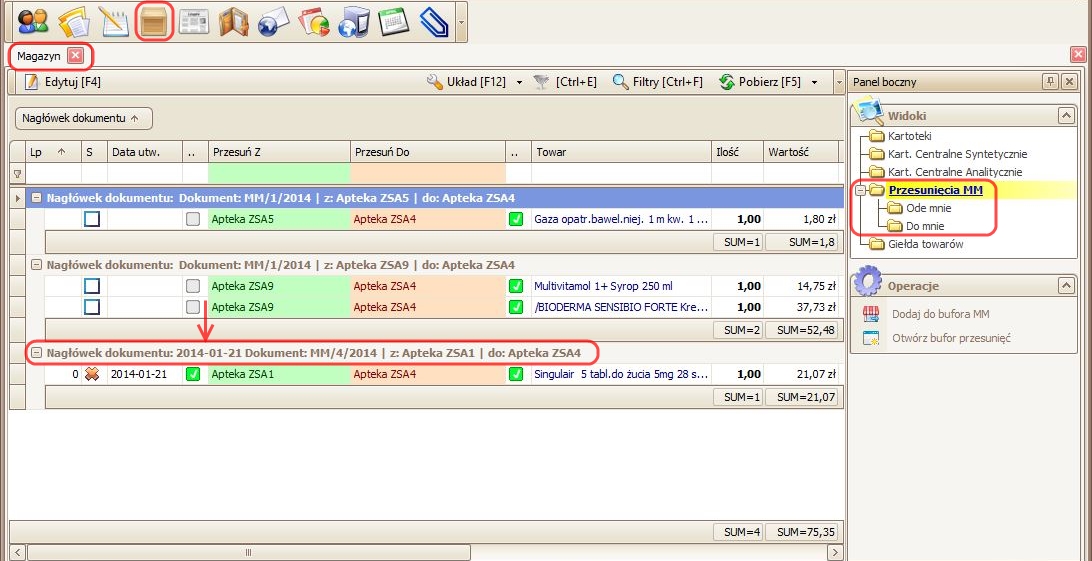 znajdujący się na pasku akcji (moduł Magazyn -> widok Przesunięciach MM – Ode mnie – > okno Edycja dokumentu MM ).
