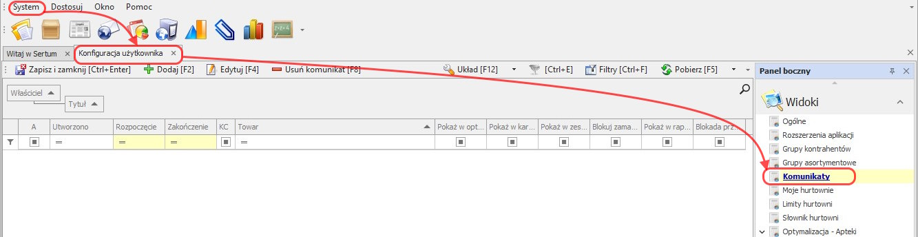System-> Konfiguracja-> widok Komunikaty