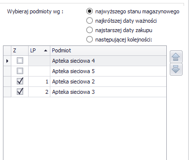 W prawej części okna można ustawić kryteria określające, z jakich aptek przesuwać towary w pierwszej kolejności.
