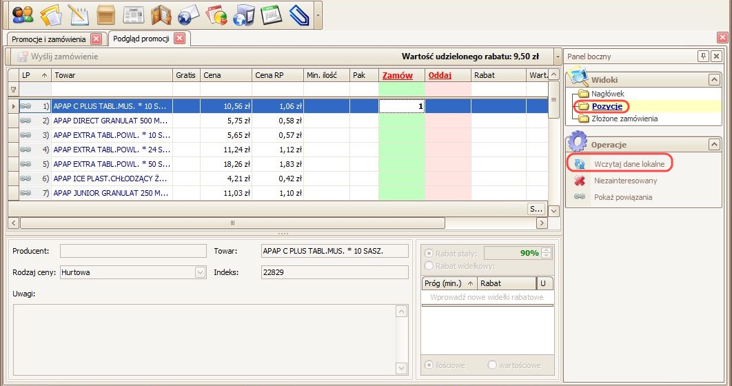 Wybrane pozycje zamówień zostaną wczytane do bufora, jak podczas wczytywania zamówienia z programu aptecznego: