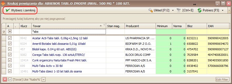 2. Dodano pola Filtrów [Ctrl+F]: Stan magazynowy (mniejszy równy niż), Data ważności do, Kartoteka centralna (zawiera), Nazwa producenta (zawiera);