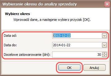 Domyślny okres analizy to miesiąc wstecz od dnia bieżącego, a domyślny okres zatowarowania to 30 dni.