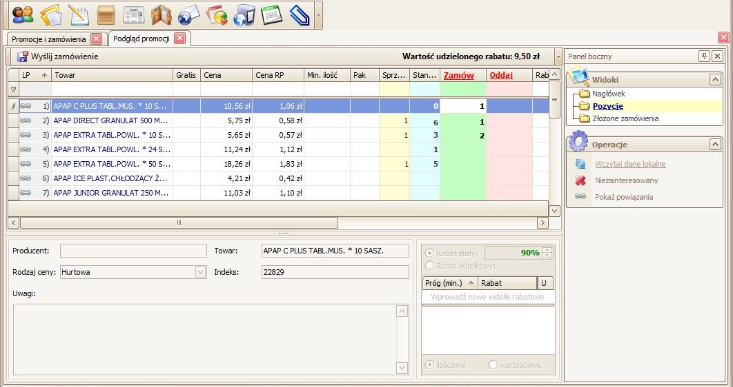 pojawią się dwie kolumny uzupełnione danymi o sprzedaży i stanach magazynowych poszczególnych towarów znajdujących się w ofercie promocyjnej, jak również zostaną zaproponowane ilości do zamówienia (zostaną wypełnione pola w kolumnie Zamów).