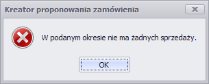 Jeśli podany zostanie przedział czasu, w którym nie dokonywano zamówień i nie dokonano sprzedaży wyskoczy okno z komunikatem: