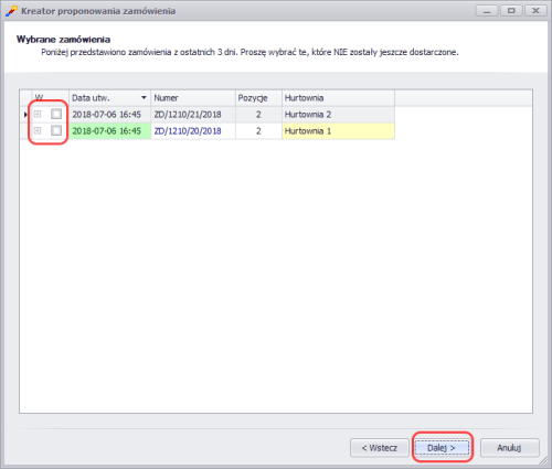 Widok zostanie przez program pominięty, jeżeli nie było wysłanego zamówienia w przeciągu ostatnich 3 dni. Klikając Dalej przechodzimy do kolejnych widoków, gdzie należy zaznaczyć: