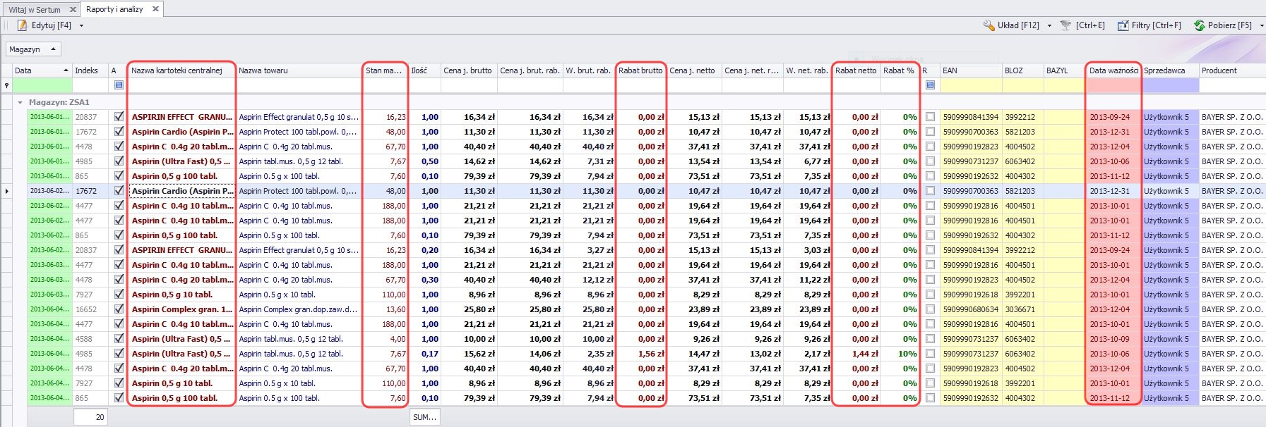 1. Zostało dodanych 6 nowych kolumn: Nazwa kartoteki centralnej, Stan magazynowy, Rabat brutto, Rabat netto, Rabat %, Data ważności;