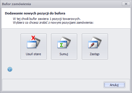 Sumuj – jeśli w buforze znajduje się już towar, który jest w nowym zamówieniu, to zamawiana ilość jest sumą zamówień starego i nowego;