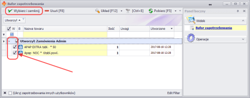 Jeżeli chcemy pozycje z bufora zapotrzebowania uwzględnić w zamówieniu, wystarczy, że zaznaczymy je w kolumnie W i klikniemy operacje Wybierz i zamknij.