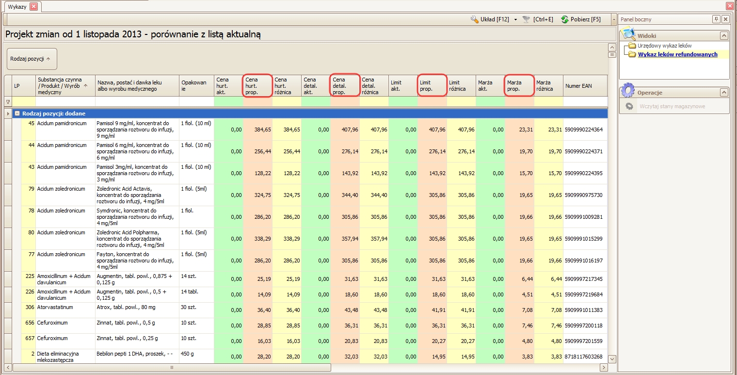 Wystarczy wczytać swoje stany magazynowe, wybierając operację znajdującą się po prawej stronie okna. Następnie dowolnie filtrując można sprawdzić, które leki tanieją w hurtowni, a które zmieniają odpłatność dla pacjentów.